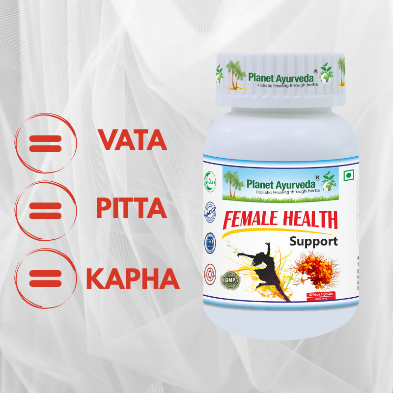 Female Health Support je čisto prírodná bylinná kombinácia, ktorá sa v ayurvédskej medicíne často používa bez akýchkoľvek vedľajších účinkov. Bylinky použité pri tomto produkte synergicky vyvažujú narušené dóše vata a pitta. Dôležitými bylinami použitými v doplnku je Ashoka, Shatavari a Lodhra. Byliny posilňujú u žien celkový reprodukčný systém a tiež zvyšujú libido, môžu sa tiež používať pri endometrióze (endometrium – sliznica maternice sa ukladá v rôznych reprodukčných orgánoch), cystách na vaječníkoch a tiež pri myóme maternice.