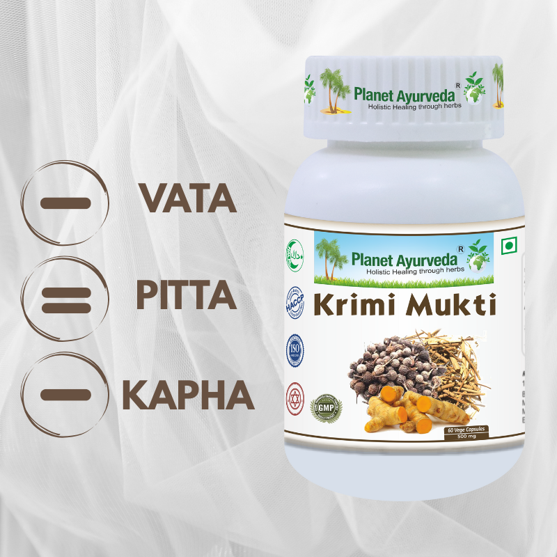 Ajurvédska zmes Krimi Mukti obsahuje 5 bylín (Afsanteen, Palash, Vidanga, Harad a Haridra), ktoré patria medzi tie s najlepším protiparazitálnym účinkom na helmintózu - ochorenie spôsobené cudzopasnými červami. Kôli svojmu antibakteriálnemu účinku nedovoľujú červom rozmnožovať sa v tráviacom trakte. Taktiež sú veľmi účinné pri bolestiach v oblasti brušnej dutiny, pri zvýšenej plynnatosti a pri nedostatočnom trávení. Zmes Krimi Mukti sa tiež využíva na podporu liečby anorexie a pomáha eliminovať toxíny z tela, čím podporuje imunitu. Keďže podporuje správne trávenie, v ajurvéde sa využíva aj pri anémii a kožných ochoreniach.
